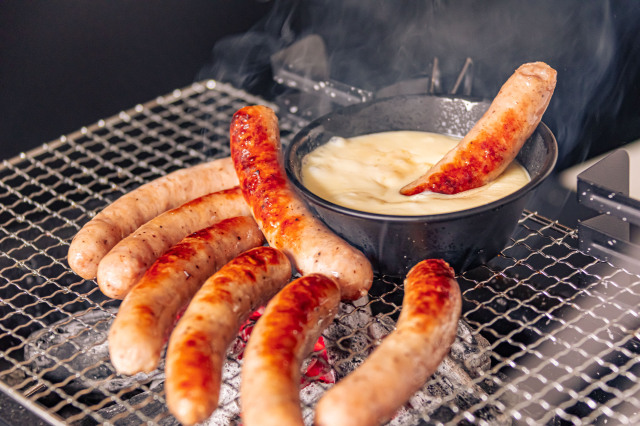 風味豊かで“肉肉しい”生ウインナーを炭火焼にします。炭火に燻煙チップ振りかけて、香りをプラスしてお楽しみください。ドリンクを合わせるならシャンパンや微発泡白ワインがおすすめ!
